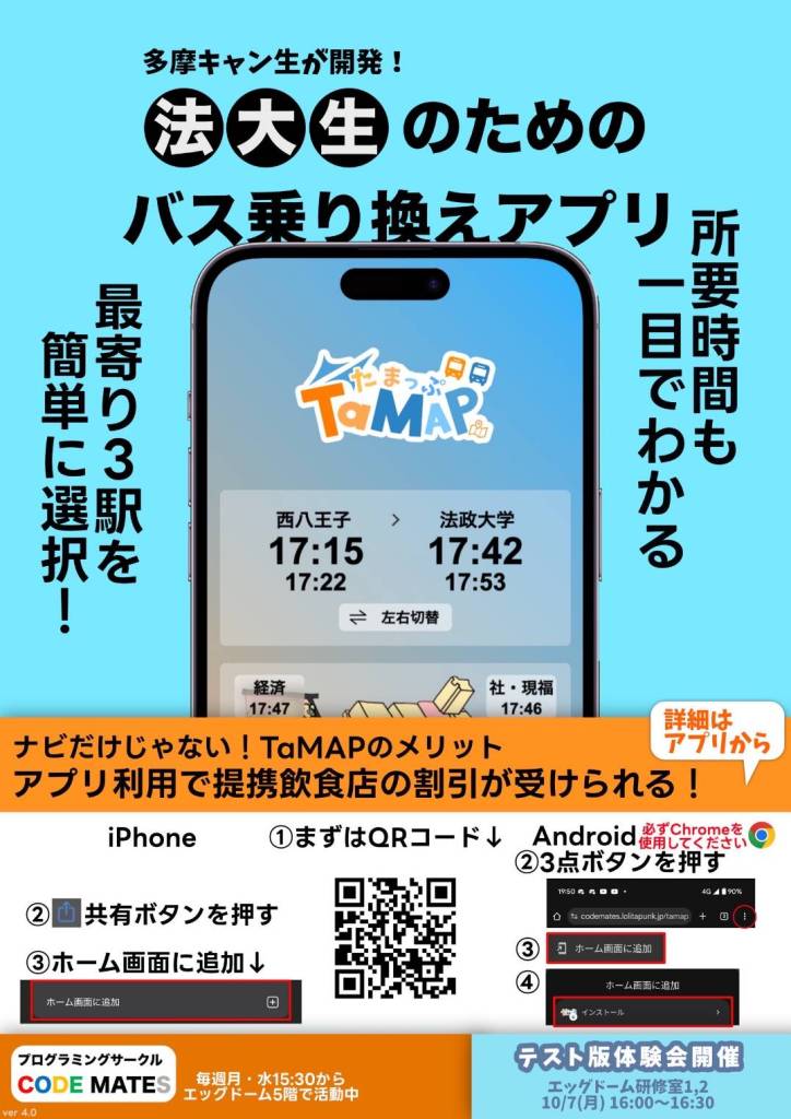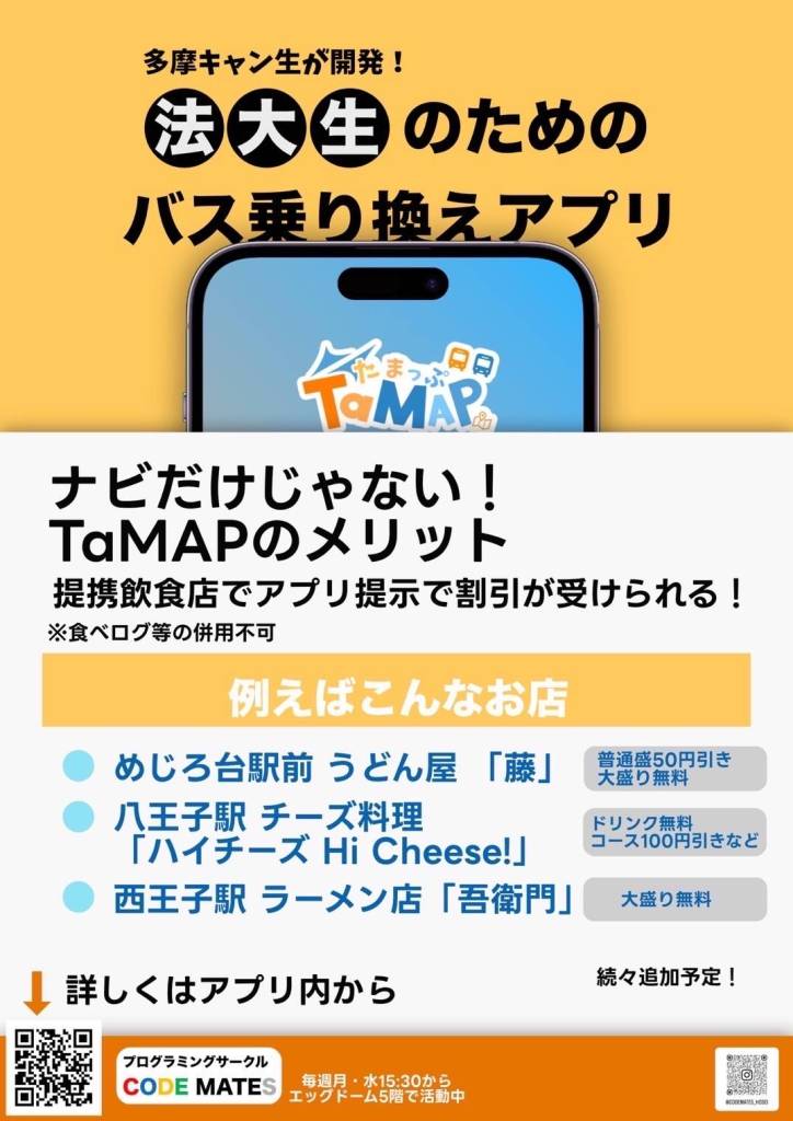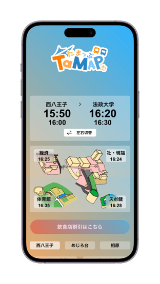設立2年目には、多摩キャンパス周辺の利便性向上に貢献するため、「たまっぷ!」アプリを開発しました。主にバスの時刻情報や大学近隣の飲食店で利用可能なクーポンを掲載しており、法政大生がより快適なキャンパスライフを送れるように設計しました。