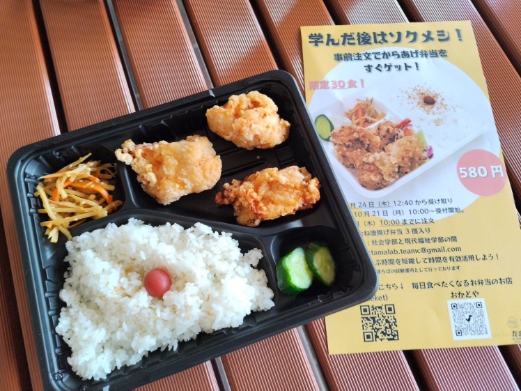 取り組みの中で、学生の昼食時の選択肢を増やしたいという想いが強く、キッチンカーを活用することや、バスの待機列でワゴン販売する案などといったトライアンドエラーを重ねていきました。最終的に事前にチケットを購入・注文してもらいワゴンで唐揚げ弁当を販売するという形にたどりつきました。販売した唐揚げ弁当は西八王子にある「おかどや」と提携し、むね肉を使った美味しい唐揚げ弁当を提供しました。