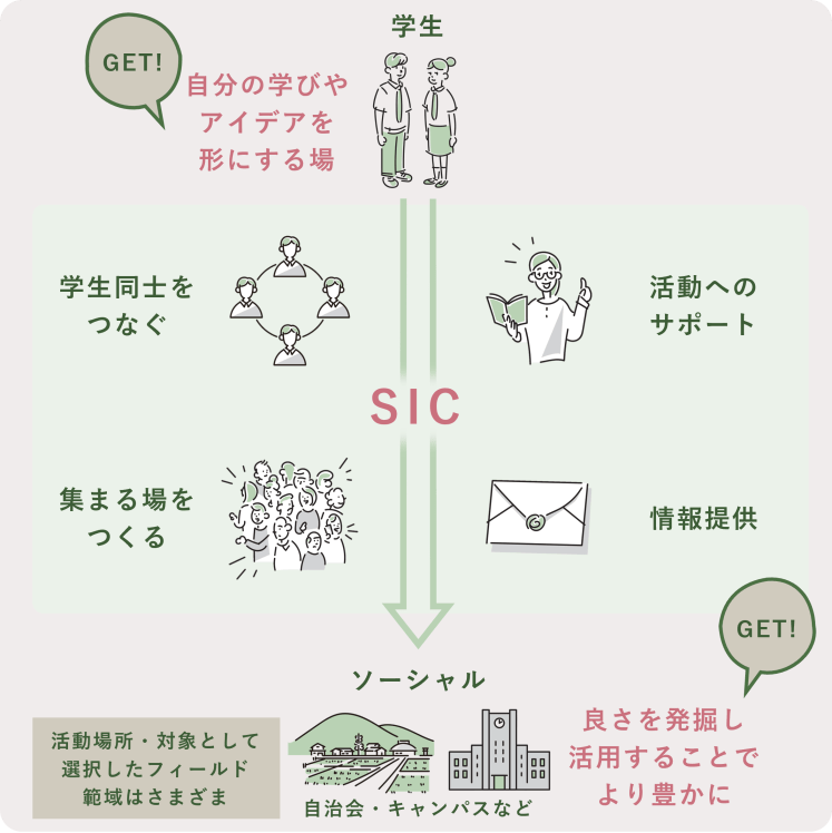 SICは、「何かやりたい」という想いを持った学生たちが集まる拠点です。ボランティア活動、地域交流、イベント企画、起業支援など、さまざまな形で「ソーシャル―社会」に貢献することを目指しています。